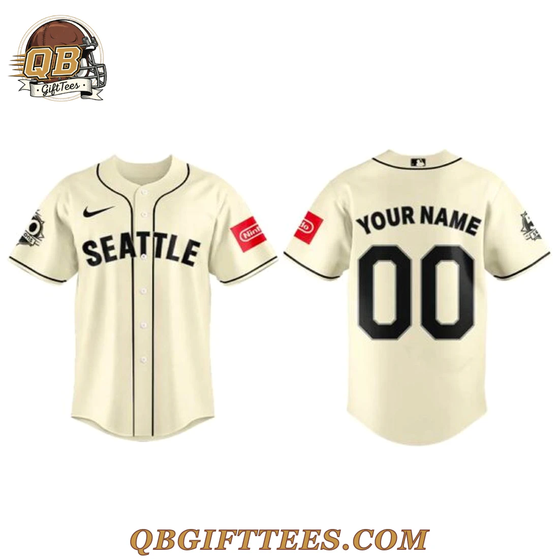 The Seattle Mariners new Steelheads for Legacy Edition Custom Name Jersey provides fans with a tangible connection to Seattle’s rich baseball heritage. This distinctive cream-colored jersey features “SEATTLE” prominently across the chest in bold black block lettering, complemented by a full button-down placket and black piping along the collar and placket. Black trim accents the short sleeve cuffs. A black swoosh is embroidered on the right chest, while the left sleeve proudly displays a circular patch commemorating the 1946 Seattle Steelheads. The right sleeve features a red Nintendo logo patch. The back of the jersey is designed for personalization, offering space for “YOUR NAME” in black block letters above two customizable black block numbers. Constructed from a lightweight, breathable polyester fabric, this jersey offers comfort and mobility, reinforced by precision embroidery and durable construction.