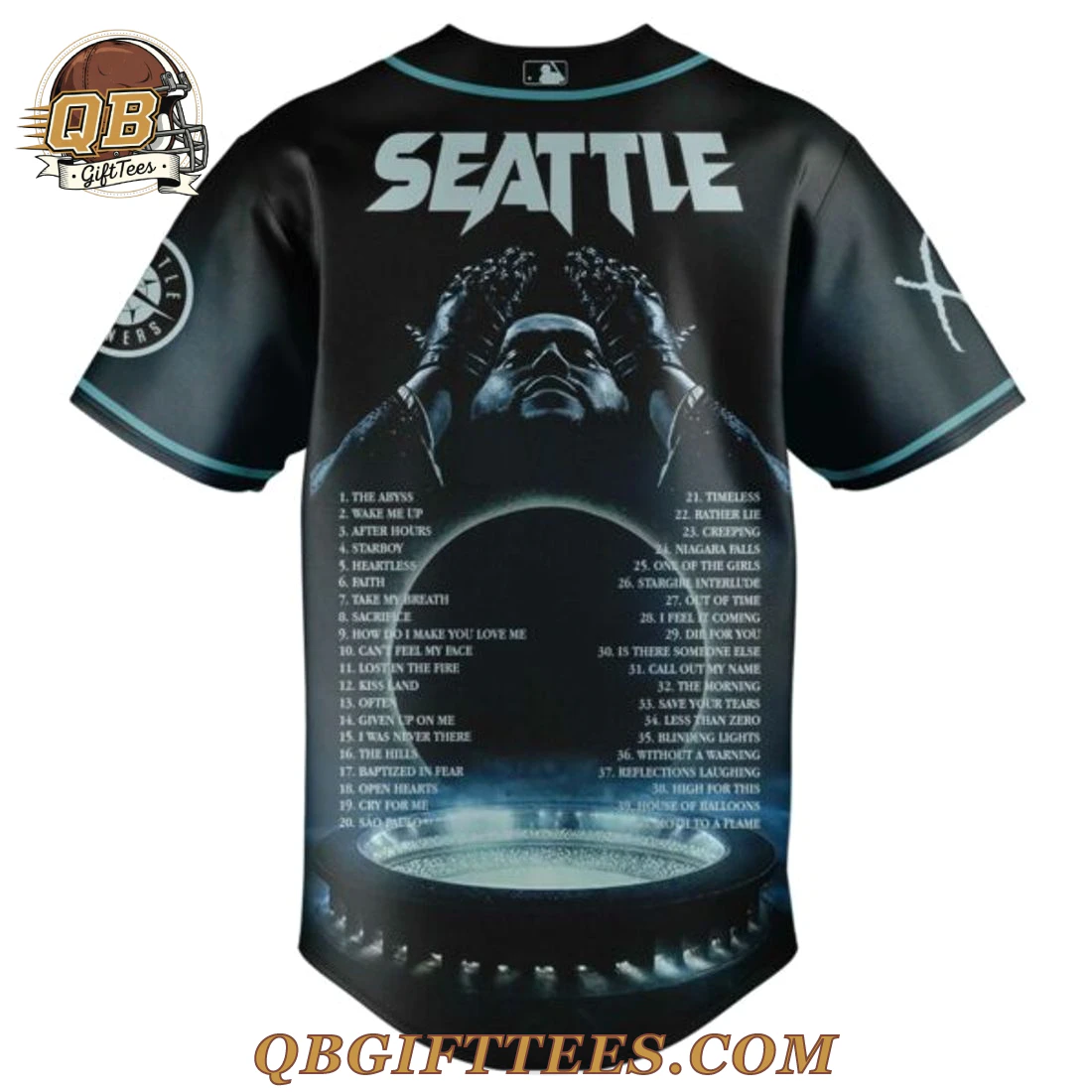 The Seattle Mariners – Weekend After Hours Till Dawn Baseball Jersey offers fans a unique blend of music and sport, celebrating the vibrant energy of both The Weeknd’s global tour and the spirit of Mariners baseball. This black full-button jersey features light blue trim along the neckline, button placket, and sleeve cuffs. Across the chest, “MARINERS” is emblazoned in a stylized light blue and white font, complemented by the Mariners “S” logo on the right chest and a swoosh on the left. The front is further customized with various light blue graphic elements, including “STARBOY + THE WEEKND,” an outline of The Weeknd’s likeness, his signature, “Call Out My Name,” and dice motifs. The left sleeve proudly displays the Seattle Mariners compass rose emblem. The back of the jersey showcases “SEATTLE” in a matching stylized font, centered above a large graphic featuring The Weeknd’s “After Hours” imagery, set against a backdrop of a stadium. Below this, a comprehensive list of 37 song titles from “The After Hours Til Dawn” tour setlist is displayed, framed by an illuminated stadium graphic. An official MLB logo is present on the back neck. Crafted from 100% breathable polyester fabric, this jersey offers a lightweight and comfortable feel, suitable for diverse climates, with an estimated fabric weight of 180-200 GSM.