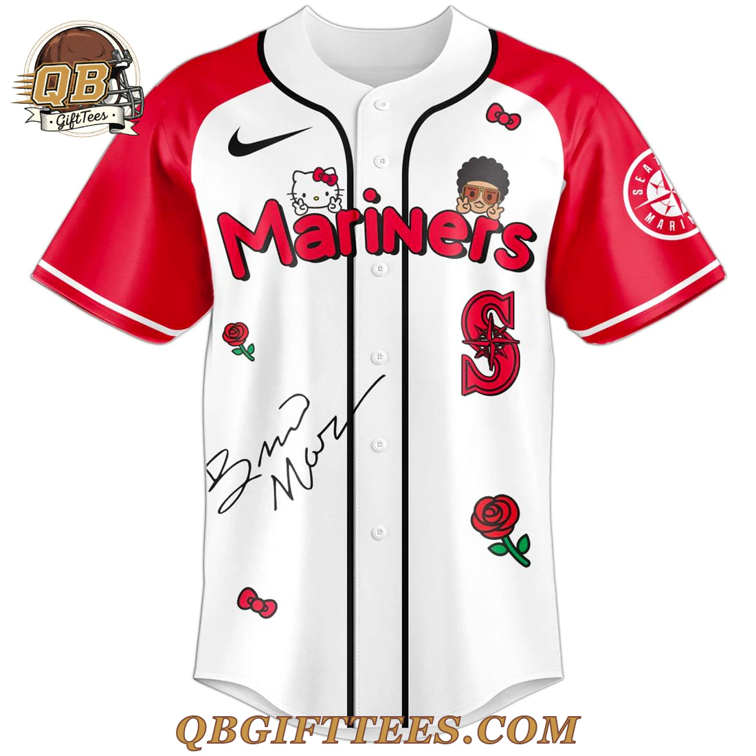 Embrace the unique fusion of music, sport, and pop culture with the Seattle Mariners x Bruno Mars & Hello Kitty 2026 Edition Baseball jersey. This collectible piece offers fans of the Seattle Mariners, Bruno Mars, and Hello Kitty a distinctive way to celebrate their passions. The jersey features a crisp white body with contrasting red raglan sleeves and a full button-front closure. On the front, the iconic “Mariners” wordmark is prominently displayed in red with a white outline, accented by a Hello Kitty head above the ‘M’ and a Bruno Mars cartoon figure above the ‘s’. A swoosh is placed on the right chest, and a Mariners compass rose patch adorns the left sleeve. The lower front includes a simulated Bruno Mars signature and the alternate Mariners ‘S’ emblem. Small red roses and Hello Kitty bows are scattered across the design. The back of the jersey showcases “Bruno Mars” in gothic script, above a large red heart featuring the Mariners ‘S’ logo, Hello Kitty, and Bruno Mars characters. “Hello Kitty” script and “The Romantic Tour Pop-Up” schedule complete the rear design. This jersey is crafted from 100% breathable polyester mesh fabric*, offering a comfortable, lightweight feel.