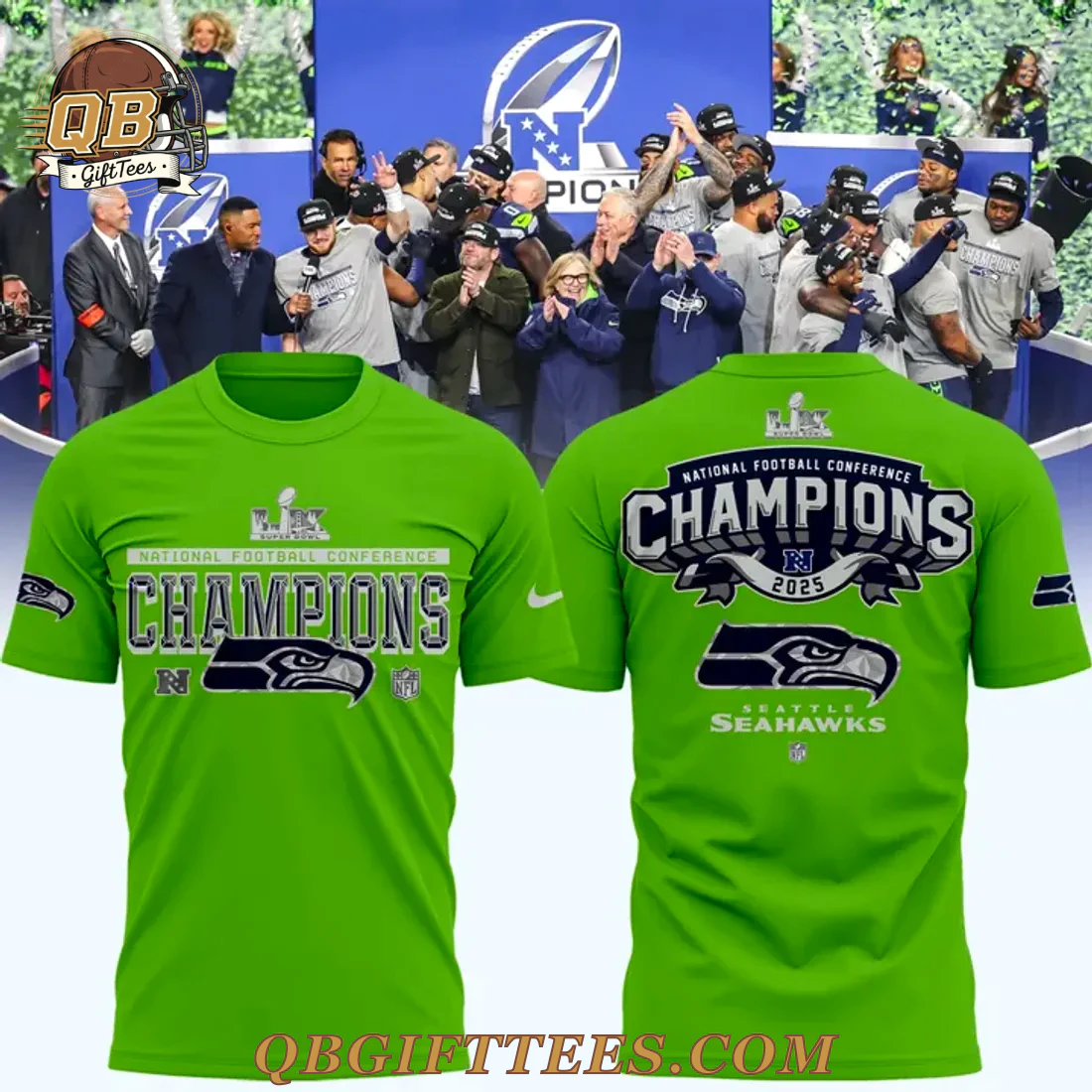 Celebrate the spirit of Seahawks football with the Seattle Seahawks Champions Locker Room Trophy Hoodie. This vibrant hoodie embodies the hopeful future for every dedicated fan, connecting generations of supporters who bleed action green and blue. The front prominently features a vivid lime green base, accented with “NATIONAL FOOTBALL CONFERENCE” text in silver/white above bold “CHAMPIONS” lettering. Below, the “N” logo is accompanied by “2025,” signaling a future triumph. The iconic Seattle Seahawks logo is centered, alongside the NFL shield and a white swoosh on the right sleeve. A distinct Seahawks emblem adorns the left sleeve. The reverse side continues the celebratory theme with “NATIONAL FOOTBALL CONFERENCE CHAMPIONS 2025” prominently displayed, featuring the team logo and “SEATTLE SEAHAWKS” text, completed with an NFL shield. Crafted from a comfortable, durable polyester blend, this mid-weight hoodie offers a soft, brushed fleece interior for lasting warmth and comfort.