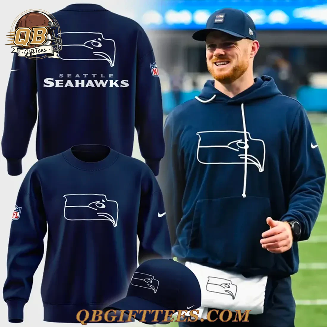 The Seattle Seahawks New Edition Hoodie represents a direct connection to the spirit and community of the 12s, uniting fans across generations and backgrounds with pride and passion. This navy blue hoodie features a prominent white outline of the iconic Seattle Seahawks eagle head logo on the front, offering a clean, contemporary design. The back proudly displays the same white outline logo positioned above “SEATTLE” and “SEAHAWKS” text in crisp white lettering, ensuring team allegiance is visible from every angle. Distinguishing details include an embroidered NFL shield patch on the left sleeve and a classic white Swoosh on the right sleeve, denoting its authentic origin. Designed for both comfort and lasting wear, this hoodie is crafted from a durable 80% cotton, 20% polyester fleece blend, offering a soft hand-feel and consistent warmth. Its substantial 9 oz/yd2 (305 gsm) fabric weight provides comfortable insulation, complete with an adjustable drawstring hood and a practical front kangaroo pocket for added functionality.