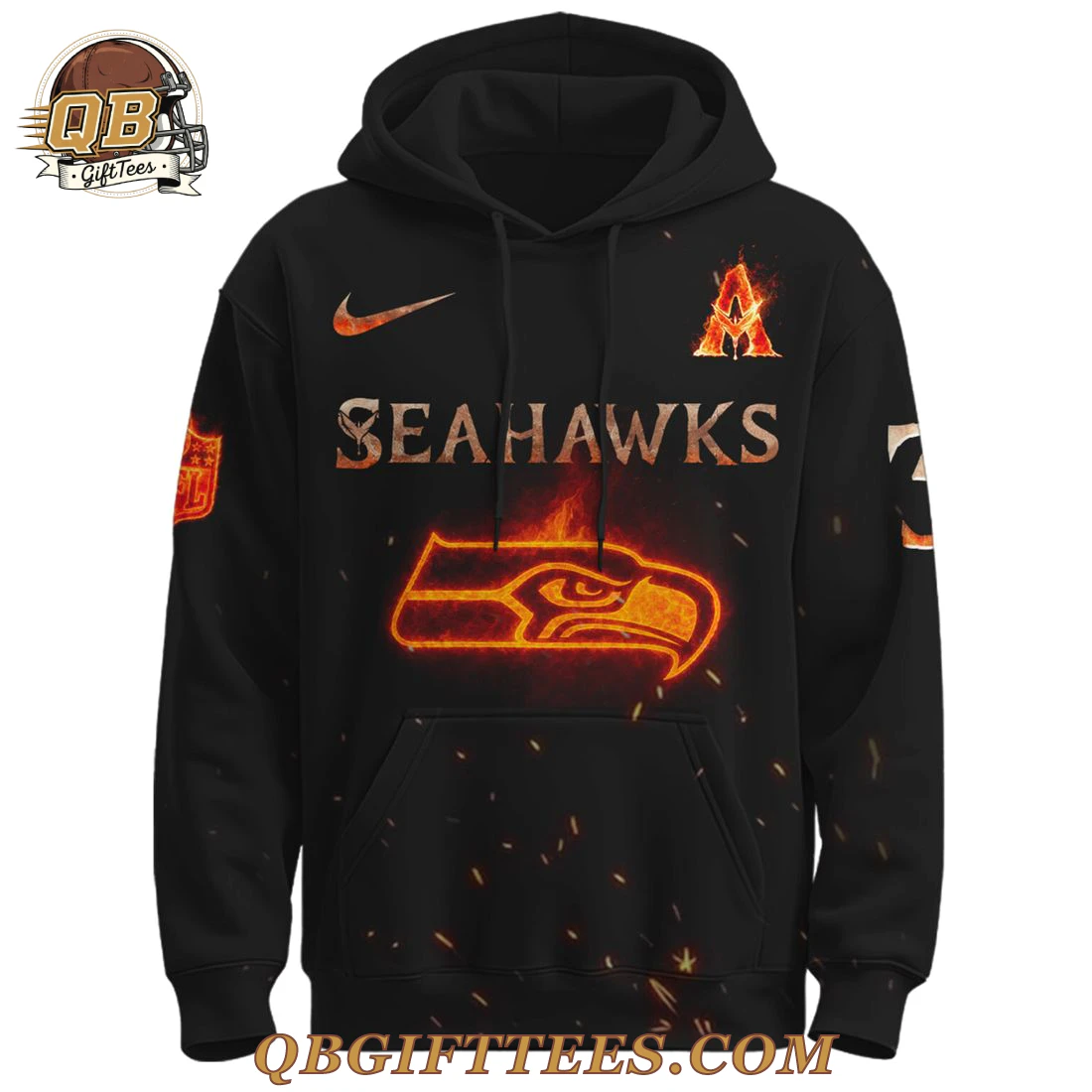 Unite your passion for the Seattle Seahawks and the epic world of Avatar with the Seattle Seahawks x Avatar Limited Edition Hoodie. This unique collectible celebrates the intensity shared by both franchises, appealing to fans who appreciate powerful narratives and unwavering team spirit. The hoodie features a deep black base, serving as a canvas for striking fiery graphics. On the front, a white swoosh is positioned on the upper left, while the word “SEAHAWKS” in a distressed, flame-licked font dominates the chest. Below it, the iconic Seattle Seahawks logo glows with an internal fire effect. A bold, fiery “A” from Avatar is prominently displayed on the upper right, and the NFL shield logo adorns the left sleeve. The back showcases a large, central fiery “A” with the Seahawks logo integrated, framed by the ‘AVATAR’ title and ‘FIRE AND ASH’ subtitle. Both front and back are accented with scattered fiery embers, and a kangaroo pocket provides functional warmth. Crafted from a comfortable 8 oz/yd² (270 gsm) blend of 50% cotton and 50% polyester fleece, this hoodie offers a durable fabric and a classic fit.