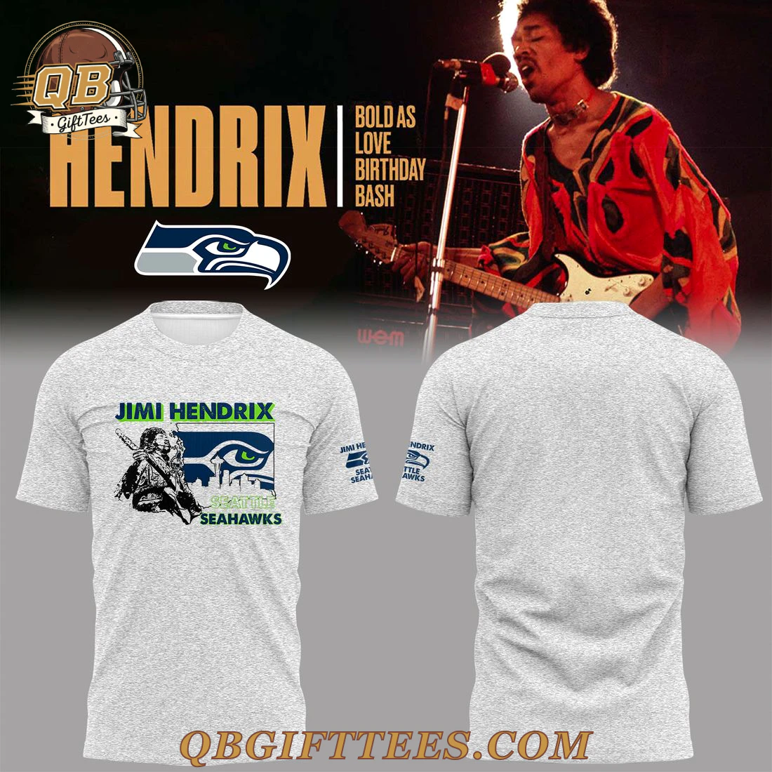 This Seattle Seahawks x Jimi Hendrix Edition Hoodie celebrates the convergence of two Seattle icons, offering fans a unique way to represent their city’s cultural and sporting heritage. Crafted from a comfortable mid-weight cotton-polyester fleece blend, approximately 8 oz (270 GSM), this pullover hoodie features a heather grey base for versatile styling. The front showcases a dynamic graphic of Jimi Hendrix mid-performance, rendered in a striking black and white silhouette. Alongside, the iconic Seattle Seahawks eye logo is prominently displayed in its classic blue and green. “JIMI HENDRIX” is boldly printed above the guitarist in green, while “SEATTLE SEAHAWKS” appears in black text below the eye logo. A smaller, complementary graphic featuring the Seahawks logo, “JIMI HENDRIX,” and “SEATTLE SEAHAWKS” is positioned on the left sleeve. The hoodie includes a practical kangaroo pocket and a comfortable drawstring hood, with no design elements on the plain heather grey back.