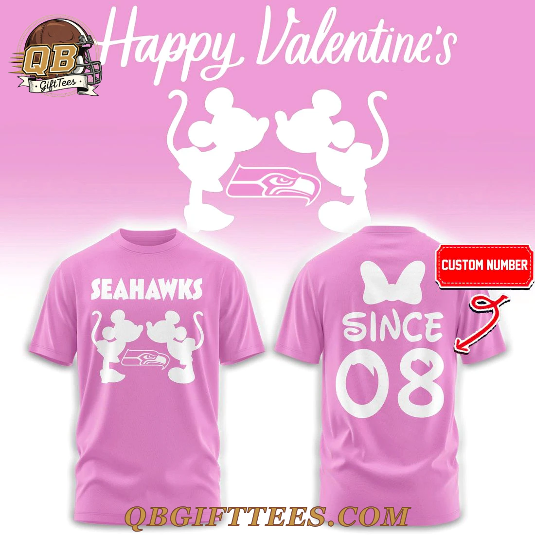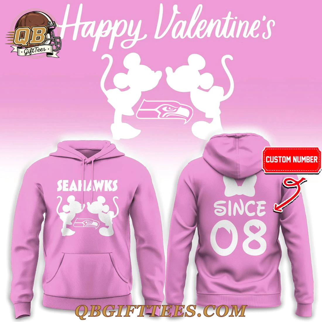 Connecting with the fierce loyalty and shared experiences of Seattle Seahawks fans, this Seattle Seahawks x Valentine Day Special Edition Hoodie offers a unique way to intertwine team pride with personal affection. Designed to resonate with diverse fan demographics, it provides a warm embrace of both passion and sentimentality without exaggeration. The hoodie presents a cheerful pink color, featuring a clear white “SEAHAWKS” text on the front. Below this, two white Mickey Mouse silhouettes are depicted facing each other, cradling the iconic Seattle Seahawks hawk head logo between them. The reverse side proudly displays a white Minnie Mouse bow situated above the word “SINCE” in white, followed by a large, customizable “08” also in white, allowing for a personal touch such as an anniversary year. Crafted from a premium 8 oz/yd² (270 gsm) blend of 50% cotton and 50% polyester fleece, this hoodie ensures both comfort and durability. It boasts a classic unisex fit, complete with a practical kangaroo pocket and ribbed cuffs and hem for a secure feel.