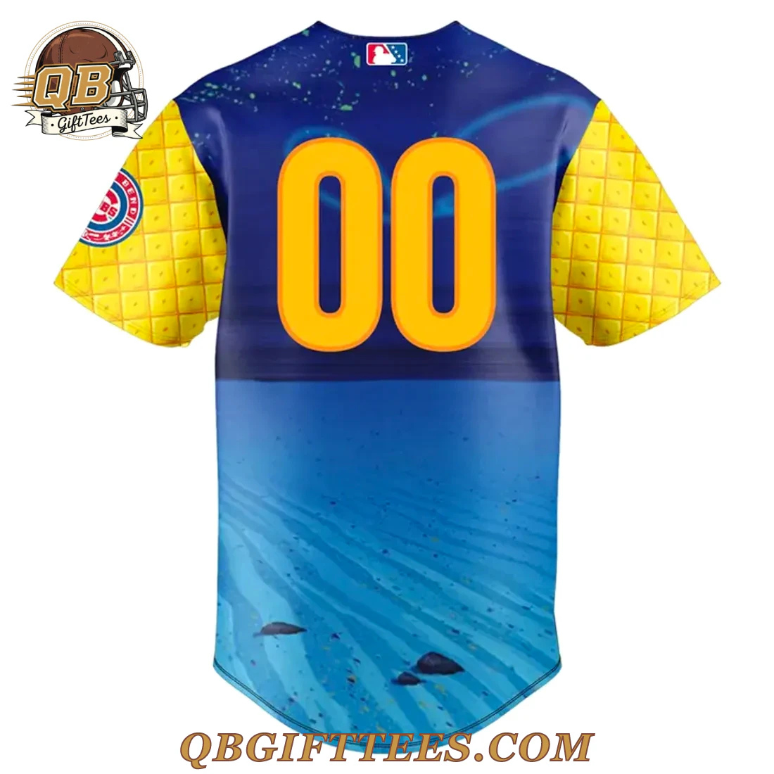 For fans who cherish both America’s pastime and the whimsical world under the sea, the South Bend Cubs SpongeBob SquarePants Night Edition Baseball Jersey offers a unique convergence. This jersey features a vibrant dark blue upper that transitions into a lighter, ripple-patterned blue, reminiscent of the ocean floor. Across the chest, the word “CUBS” is prominently displayed in bold yellow lettering, beneath which a lively scene unfolds: SpongeBob, Patrick, Squidward, Mr. Krabs, and Plankton are depicted enjoying a campfire, complete with a tent. The short sleeves are a striking yellow, adorned with a distinctive square-patterned texture, evoking SpongeBob’s iconic pineapple home. The left sleeve proudly displays the official South Bend Cubs logo. The back mirrors the front’s oceanic blue gradient, featuring a large yellow “00” centered, topped by the official MLB batterman logo. Crafted from a lightweight, breathable polyester fabric, this jersey is designed for comfort and durability, though specific material weight and precise dimensions are not visually verifiable from the imagery provided.