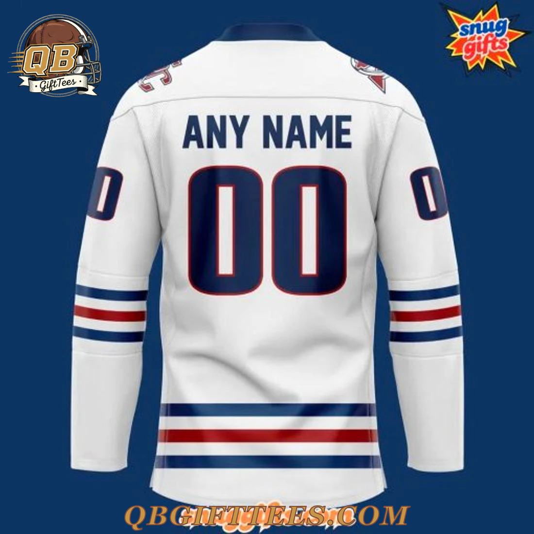 The South Carolina Stingrays Rock the Retro Limited Edition Hockey Jersey offers fans a direct connection to a cherished era of team history, allowing both long-time supporters and new enthusiasts to celebrate the legacy. The jersey presents a clean white base, accented by a deep navy blue V-neck collar. The front features the iconic South Carolina Stingrays primary logo prominently, depicting a grey stingray holding a hockey stick, with “South Carolina Stingrays” text positioned beneath it. A small “AK” logo is visible below the collar. Each sleeve is detailed with three horizontal stripes in red, white, and navy blue on the forearms, and a “0” appears on both shoulders. The reverse side is designed to display a personalized “ANY NAME” above the customizable large “00” number, rendered in navy blue with a red outline. This garment is constructed from 100% polyester fabric, chosen for its lightweight feel and breathable characteristics, typical of athletic performance wear, ensuring comfort during various activities.