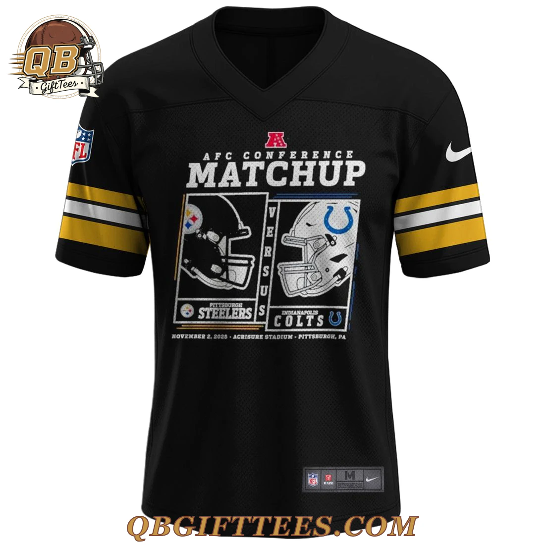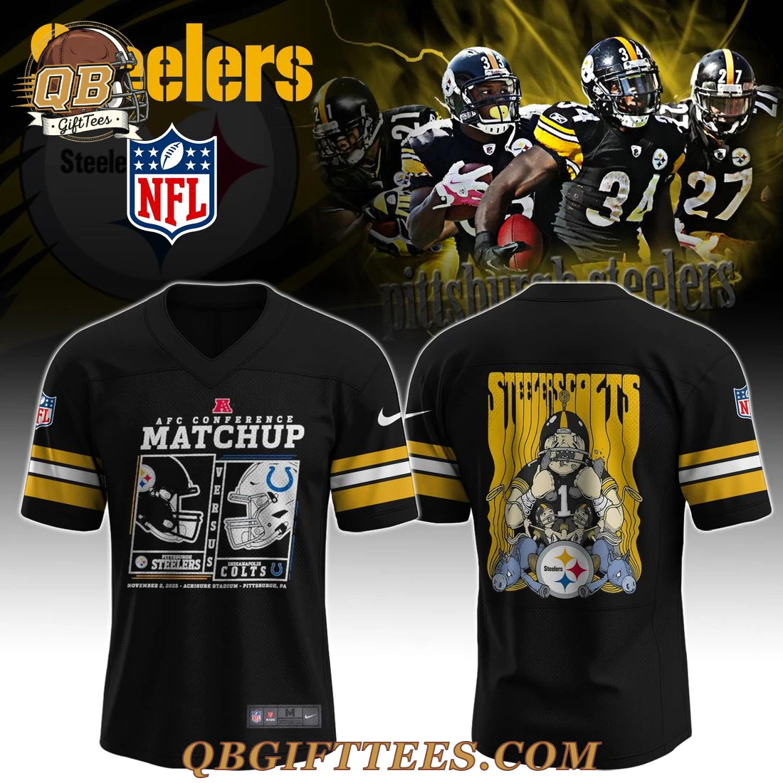 The Steelers Pride x The Black and Gold Standard Special Edition Jersey is a tribute to the enduring spirit of the Pittsburgh Steelers, connecting fans across generations through shared passion and iconic team moments. This black, V-neck jersey features distinctive yellow and white stripe accents on the sleeves. The front proudly displays an “AFC Conference MATCHUP” graphic, showcasing the Pittsburgh Steelers’ helmet on the left and the Indianapolis Colts’ helmet on the right, separated by “VERSUS.” Below the helmets, the respective team names and logos are featured alongside the date “NOVEMBER 2, 20XX – ACRIBURE STADIUM – PITTSBURGH, PA” as depicted. Official NFL shield and swoosh logos are visible on the sleeves and upper chest. The back of the jersey presents a unique, stylized illustration of a muscular Steelers player in a helmet, surrounded by bold “STEELERS” text with a drip effect, atop a pile of footballs, flanked by two blue donkey-like mascots, with the classic Steelers logo centrally placed below. This jersey is crafted from a premium, durable, and moisture-wicking polyester blend, designed for comfort and longevity.