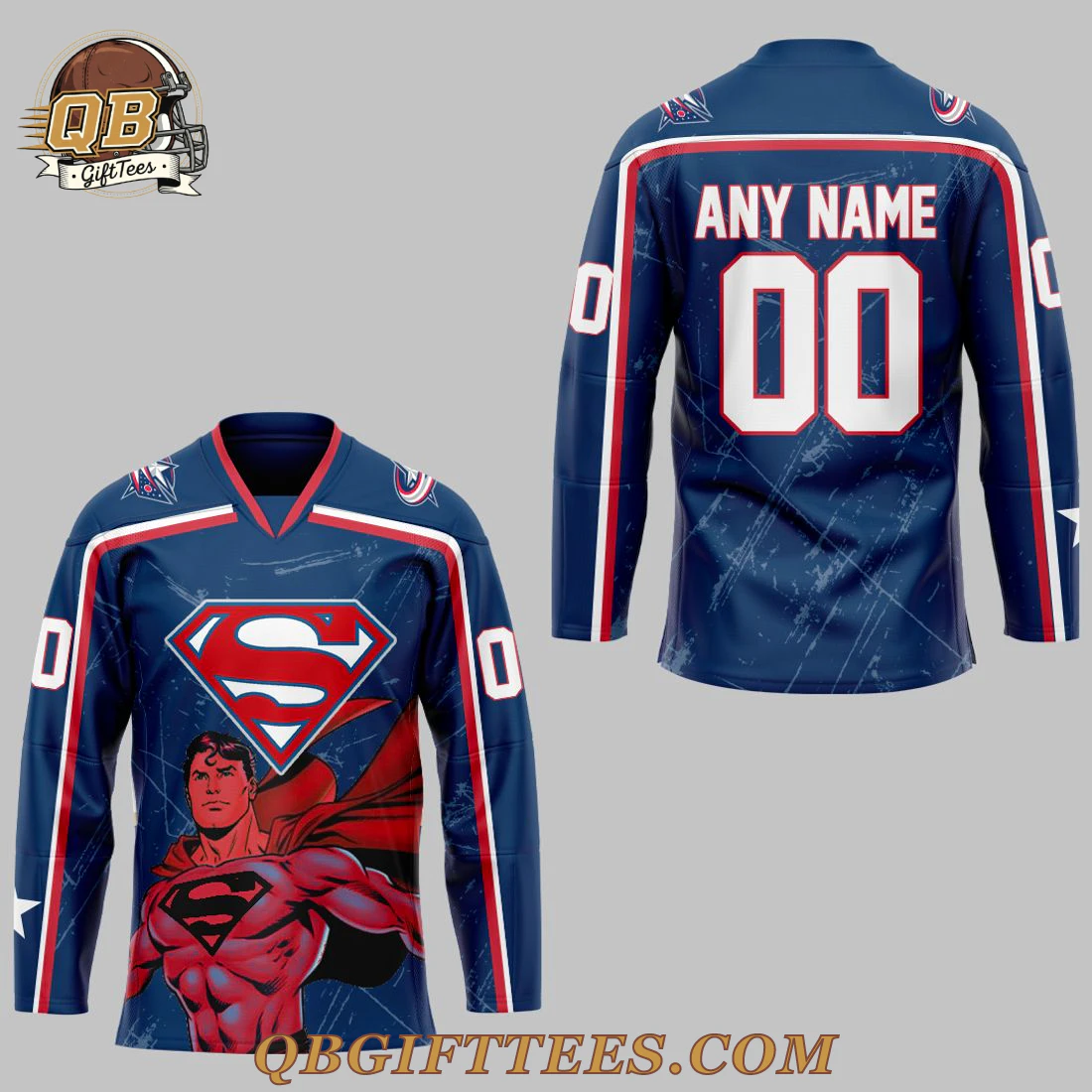 For fans who carry the spirit of heroism and sportsmanship, the Superman Night Limited Edition Hockey Jersey offers a unique convergence of iconic imagery and athletic style. This distinctive jersey features a deep navy blue base, serving as the perfect backdrop for the vibrant graphics. The front is dominated by a bold, classic red and white Superman “S” shield, beneath which a powerful, comic-style illustration of Superman himself takes flight, cape flowing. Red and white striped accents adorn the V-neck collar and run down the sleeves, creating a dynamic contrast. Each shoulder proudly displays the Columbus Blue Jackets team logo patch, while the sleeves feature large white numbers “0”. The jersey is crafted from durable 100% performance polyester knit fabric, designed for comfort and longevity. This material typically weighs around 250 GSM, offering a substantial yet breathable feel suitable for various activities.