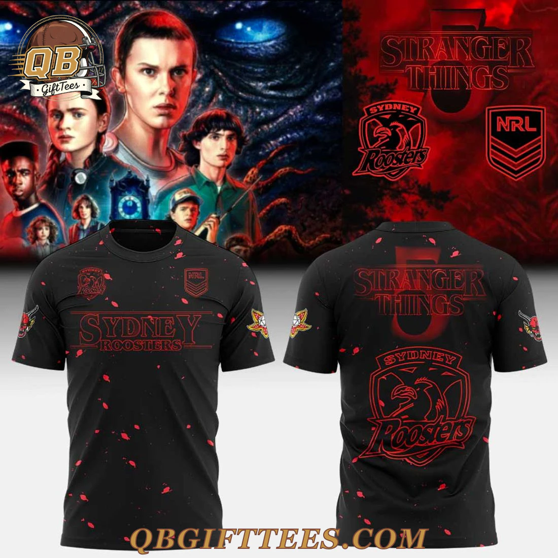 The Sydney Roosters Stranger Things 5 Special Edition Hoodie unites the fierce loyalty of Roosters fans with the thrilling, mysterious world of Hawkins. This unique crossover celebrates two distinct passions, offering a statement piece for supporters who appreciate both rugby league heritage and supernatural storytelling. The design features a striking black base with an all-over red splatter graphic, evoking the unsettling aesthetic of the Upside Down. On the front, the left chest proudly displays the red Sydney Roosters logo with ‘NRL’ positioned above, while the right chest carries the NRL chevron. Centered on the chest, “SYDNEY Roosters” is printed in bold red. Both sleeves include the Sydney Roosters logo in matching red. The reverse of the hoodie showcases the iconic “STRANGER THINGS” logo across the upper back in red, beneath which a larger Sydney Roosters emblem is prominently featured, also in red. Crafted from a comfortable and durable poly-cotton blend, this pullover hoodie features a generous front kangaroo pocket and an adjustable drawstring hood, ideal for showcasing the vibrant, full-sublimation print.
