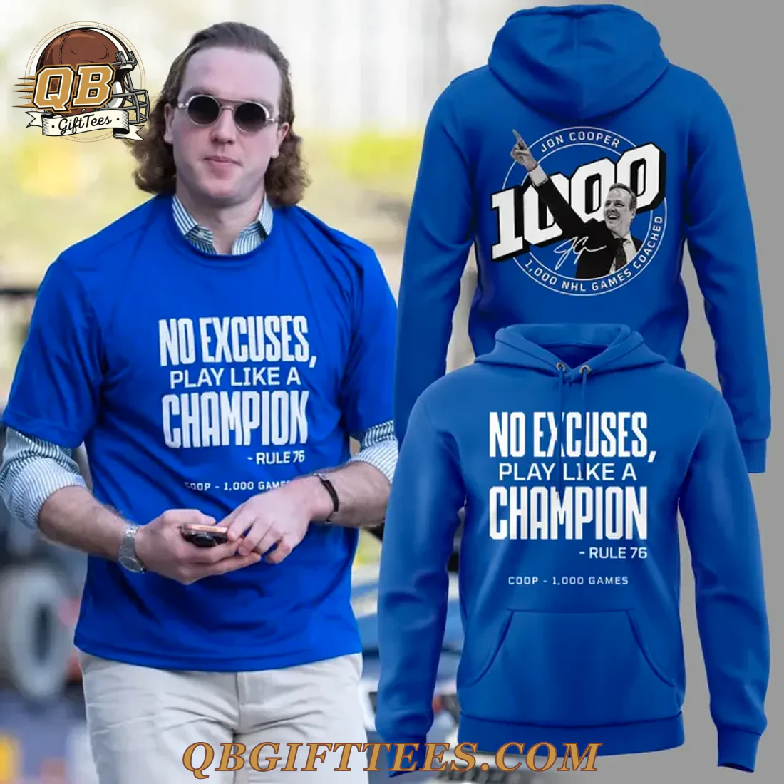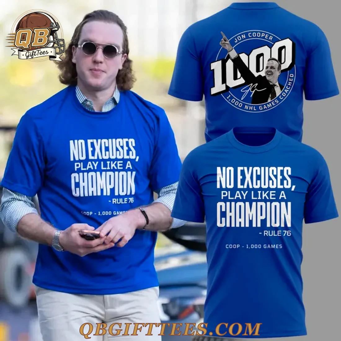 For every Tampa Bay Lightning fan, whether you’ve followed the team for decades or just joined the Bolts Nation, this Tampa Bay Lightning Jon Cooper 1000 Games Edition T-Shirt represents a monumental achievement and the enduring spirit of a championship coach. The royal blue shirt features a clean, direct message on the front in crisp white text: “NO EXCUSES, PLAY LIKE A CHAMPION – RULE 76,” followed by “COOP – 1,000 GAMES.” The reverse side celebrates the milestone with “JON COOPER” emblazoned above a large “1000,” incorporating an image of Coach Cooper raising his arm in triumph, encircled by “1,000 NHL GAMES COACHED.” This tee is crafted from premium, breathable 5.3 oz/yd² (180 g/m²) ring-spun cotton, offering a soft feel and durable wear. It features a classic crew neck and short sleeves, designed for a comfortable, true-to-size fit in standard adult dimensions.