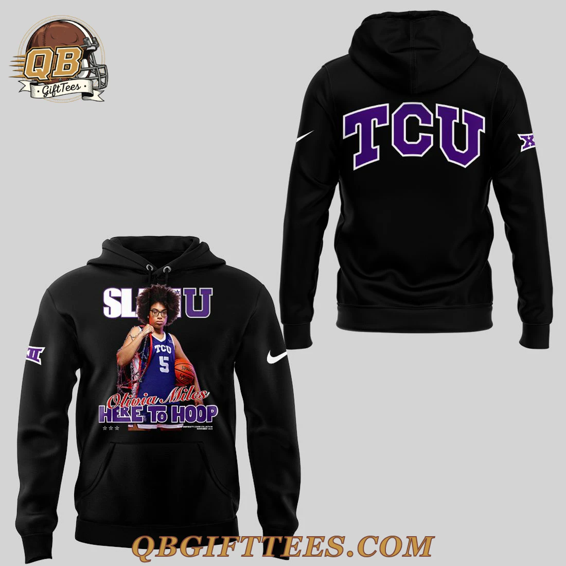 For every devoted fan, wearing your colors is a statement of pride and connection. The TCU Horned Frogs Special Edition Hoodie lets you celebrate your allegiance to TCU Basketball in distinctive style. This black pullover hoodie features a vibrant design on the front, prominently displaying an image of student-athlete Aaliyah Miles in her #5 TCU jersey, rendered with “Aaliyah Miles” in cursive purple above “HERO TO HOOP” in block purple with a red highlight. The top left chest includes a subtle “TCU” in white and purple outline, balanced by a white swoosh on the right chest. The left sleeve proudly showcases the iconic TCU Horned Frogs logo. On the back, a large, bold “TCU” in purple with a white outline makes a clear statement, complemented by another TCU Horned Frogs logo on the right sleeve. Crafted from a durable 8.0 oz/yd² (271 g/m²) 50% cotton/50% polyester preshrunk fleece blend, this hoodie offers a comfortable yet robust feel.