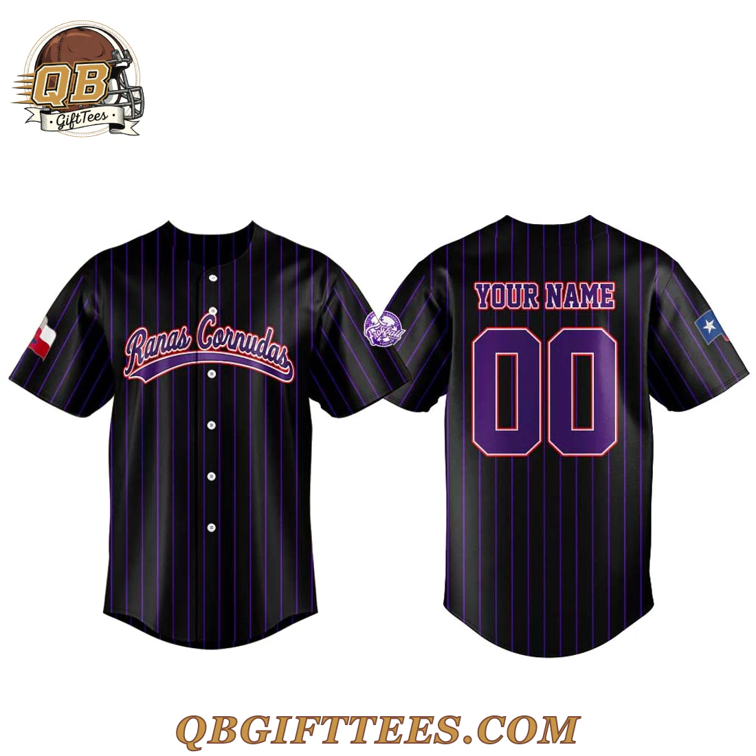 The TCU Horned Frogs x Ranas Cornudas 2026 For Fan Jersey offers a unique way for fans to connect with their team, celebrating the vibrant spirit of Fort Worth baseball and the rich heritage of the Horned Frogs. This jersey design unites diverse fan bases, acknowledging the cultural significance of “Ranas Cornudas” as a direct translation of the beloved mascot. The jersey features a sophisticated black base with subtle vertical purple pinstripes throughout. On the front, “Ranas Cornudas” is emblazoned in a stylized script font, rendered in deep purple with a crisp white outline. The left sleeve proudly displays the iconic Texas state flag, while the right sleeve features a distinct circular emblem in purple and white, depicting a stylized horned frog. The back is designed for personalization, offering space for “YOUR NAME” above a prominent “00” in purple with a white outline. Crafted from a lightweight, breathable 100% polyester fabric, this jersey is designed for comfort and durability*.