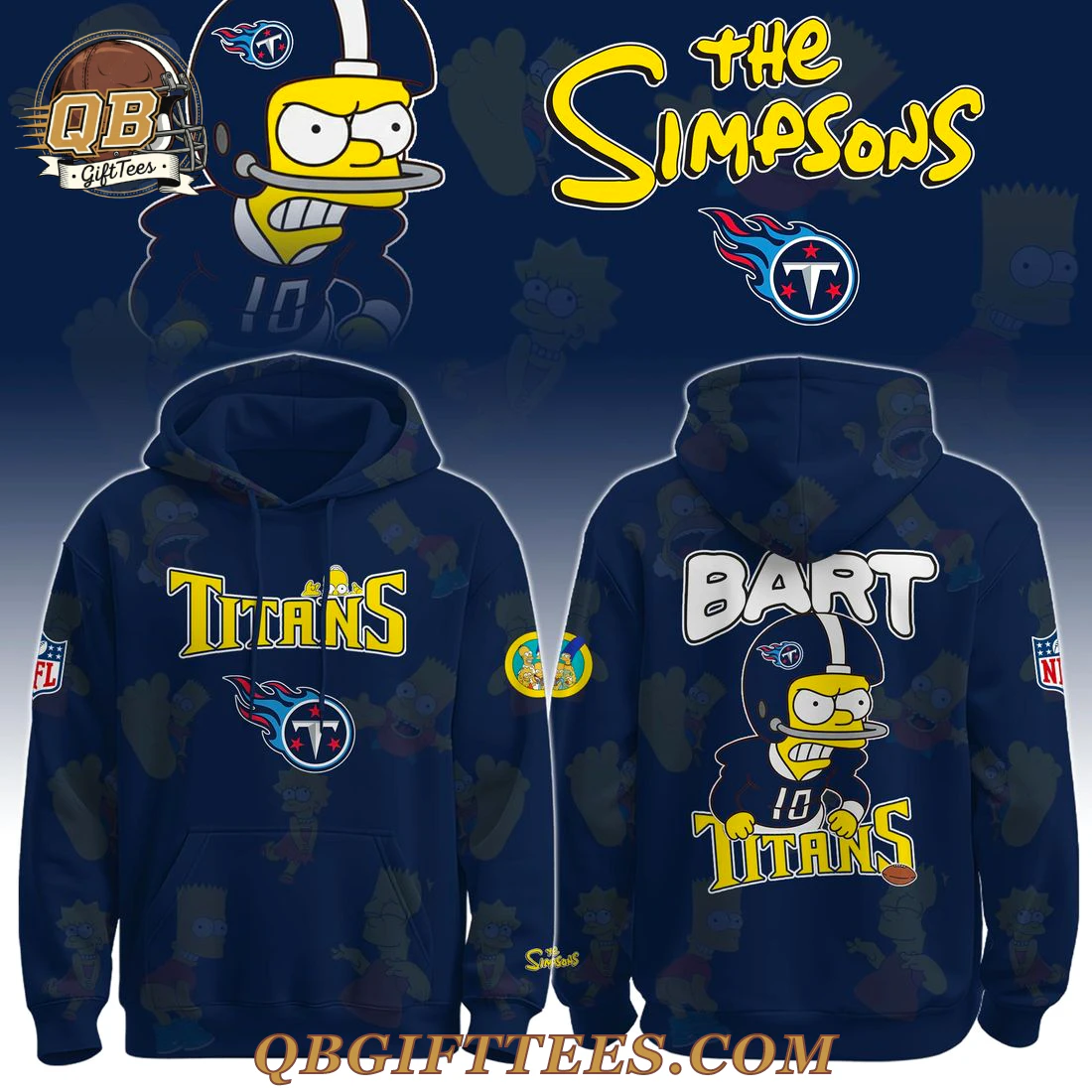 For Tennessee Titans fans who appreciate a touch of iconic pop culture, the Tennessee Titans x The Simpson Special Edition Hoodie blends team loyalty with timeless animation. This unique navy blue hoodie features an all-over sublimated print of various Homer, Bart, and Lisa Simpson characters subtly faded into the background. The front proudly displays “TITANS” in a bold yellow font with a white outline, accented by a small, haloed Homer Simpson head above the ‘A’. Below this, the official Tennessee Titans flaming thumbtack logo is prominently featured. The left sleeve carries the NFL shield logo, while the right sleeve showcases a circular emblem of the full Simpson family. The back of the hoodie presents “BART” in large white lettering, below which a determined Bart Simpson is depicted in a Titans football helmet and jersey number 10, standing above another “TITANS” wordmark. A second NFL shield logo is visible on the right sleeve. Crafted from a comfortable cotton-polyester fleece blend, this hoodie is designed as a mid-weight garment, approximately 8-10 oz/sq yd, ensuring durable comfort for everyday wear. It features a standard adult hooded sweatshirt silhouette with a front kangaroo pocket and ribbed cuffs and hem.
