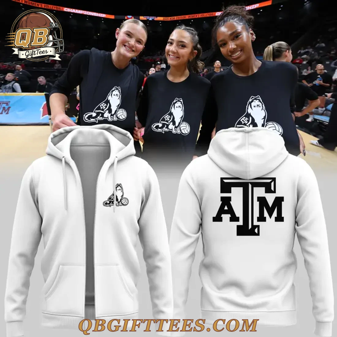 For Aggies fans, this Texas A&M Aggies Limited Edition White Hoodie embodies unwavering spirit and support, a versatile garment appealing to students, alumni, and passionate supporters alike. The clean white base highlights the distinctive black graphics. On the front, a finely detailed illustration of a Rough Collie, strikingly similar to the beloved Reveille, sits regally beside a volleyball, symbolizing a blend of iconic tradition and athletic prowess. The design is rendered with crisp, solid black lines, ensuring clear visibility and contrast against the bright white fabric. This classic pullover hoodie features a spacious front kangaroo pocket and ribbed cuffs and hem for a comfortable, secure fit. The reverse side proudly displays the bold, block “T AM” Texas A&M athletic logo in black, centered for maximum impact. Crafted from a mid-weight, 80% cotton / 20% polyester fleece blend, this Texas A&M Aggies Limited Edition White Hoodie offers a soft interior feel and durable construction designed for lasting wear.