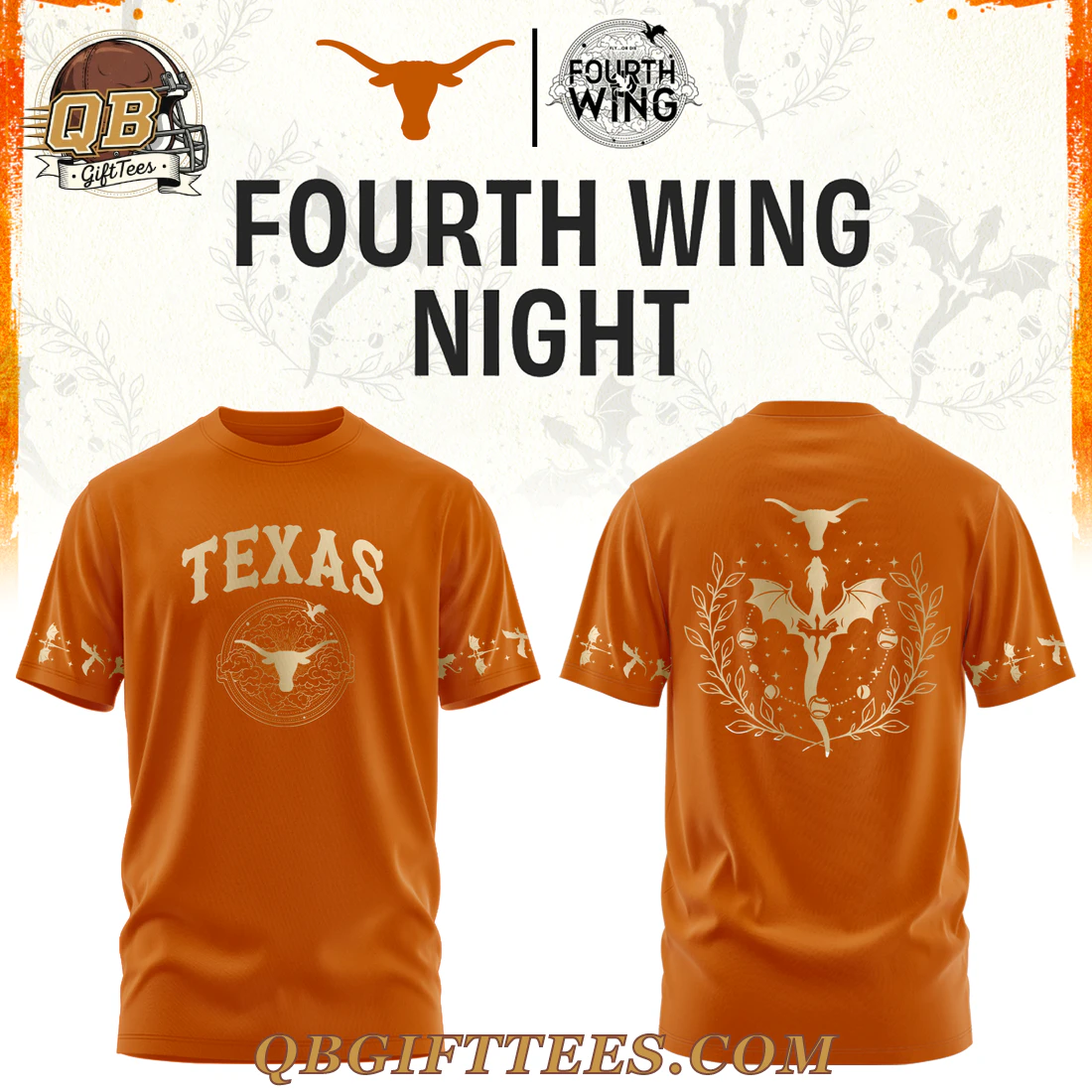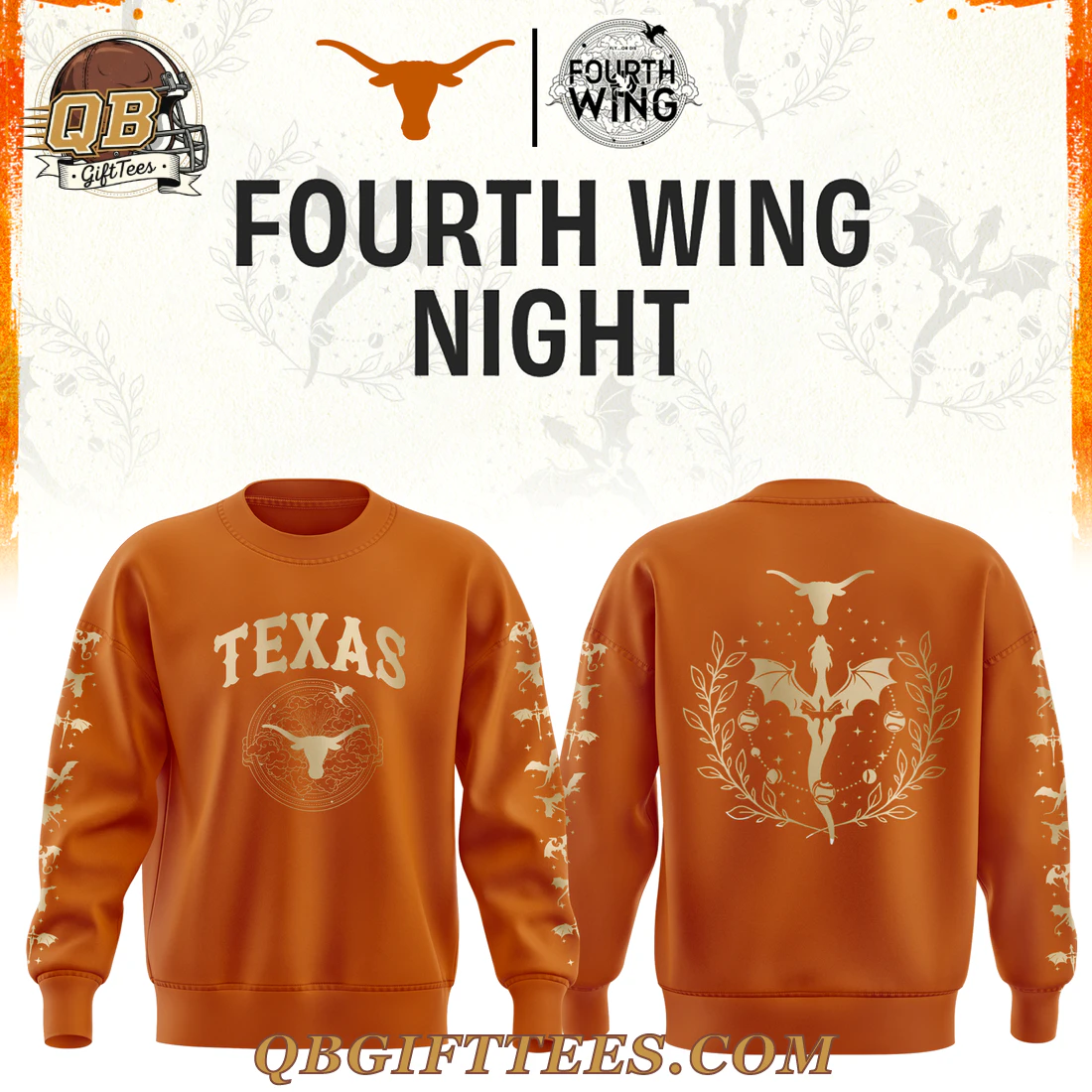 Embrace the spirit of two powerful fandoms with the Texas Longhorns Fourth Wing Night Edition Hoodie. This unique piece connects the enduring legacy of the Texas Longhorns with the captivating world of Fourth Wing. The rich burnt orange base sets the stage for intricate metallic gold designs. On the front, “TEXAS” is proudly displayed in a collegiate-style font, centered above a circular emblem that masterfully combines the iconic Longhorn skull with stylized dragon wings, stars, and subtle celestial patterns. The back features a striking metallic gold graphic of a prominent Longhorn skull resting above a dynamic dragon silhouette, elegantly framed by a detailed wreath of leaves, accented with stars and crescent moons. Both sleeves showcase a repeating pattern of smaller metallic gold dragon silhouettes and celestial motifs. Crafted from a premium blend of 80% cotton and 20% polyester fleece, this hoodie offers mid-weight comfort suitable for various climates, chosen for its soft interior feel and durable exterior finish.