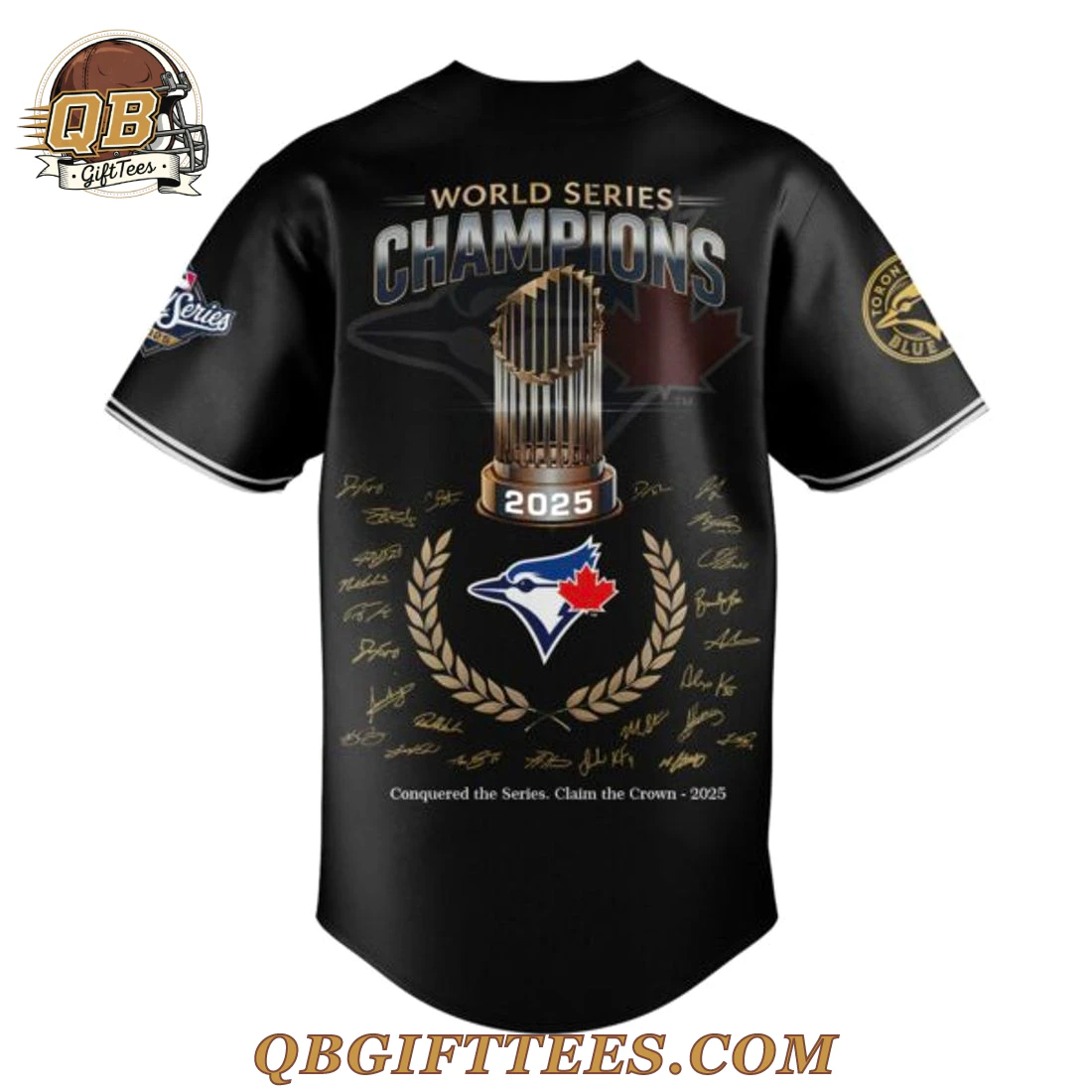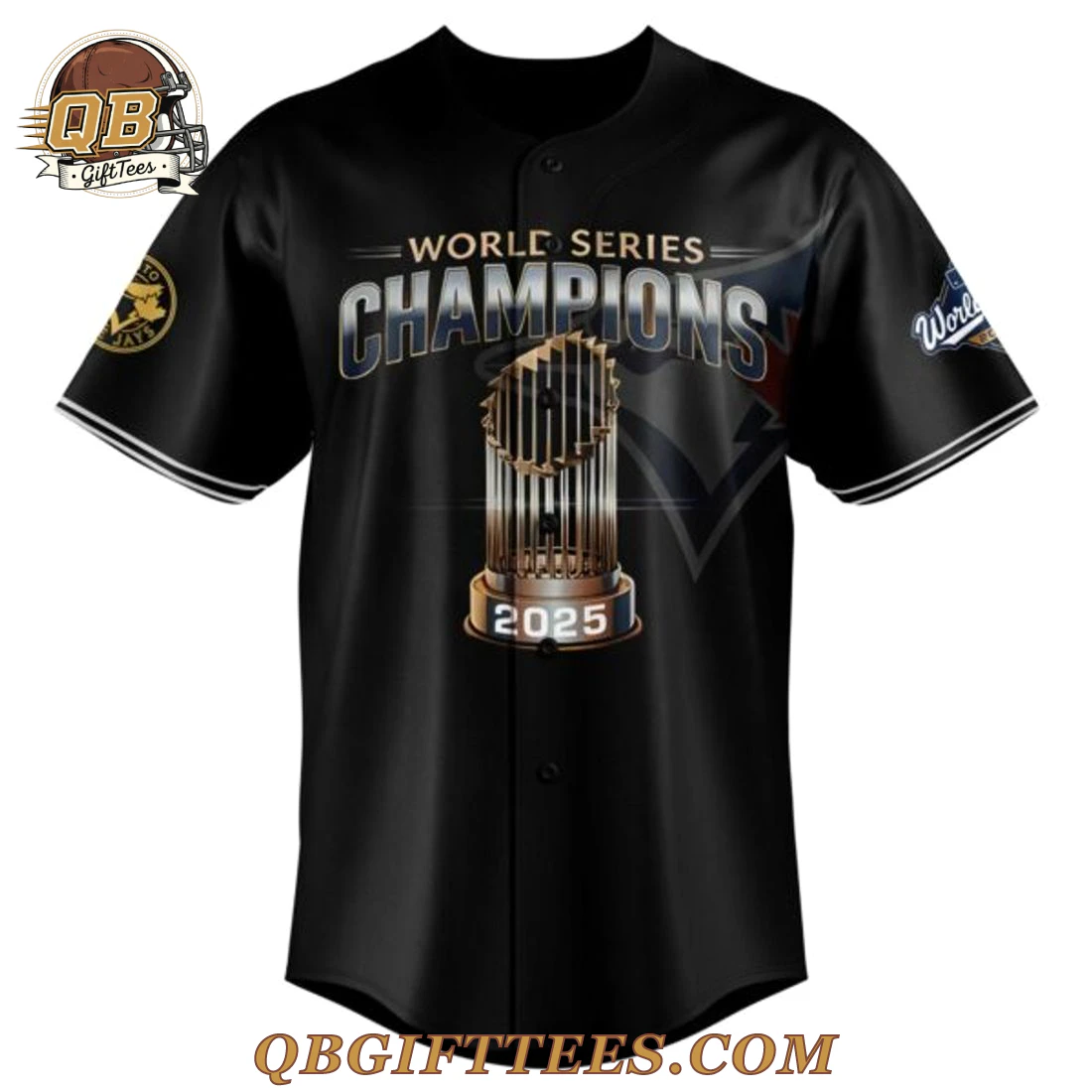 The Toronto Blue Jays 2025 World Series Champions Special Edition Jersey embodies the aspirational spirit and unwavering hope of every Blue Jays fan, a true testament to the dream of future glory for all who bleed blue. This black, full-button athletic jersey features “WORLD SERIES” in distinguished gold lettering above “CHAMPIONS” with a dynamic silver-to-gold gradient finish on the front, overlaid on a subtle, ghosted Toronto Blue Jays logo. Dominating the central design is a meticulously detailed depiction of the Commissioner’s Trophy in metallic bronze and gold tones, proudly bearing “2025” at its base. The sleeves are accented with crisp white piping, and the wearer’s right sleeve displays a circular patch featuring the classic Toronto Blue Jays logo. The back mirrors the front’s “WORLD SERIES CHAMPIONS” text and trophy, adding a central Blue Jays bird head with a red maple leaf, encircled by a gold laurel wreath. Simulated player signatures are arranged below, accompanied by the motivational text, “Conquered the Series. Claim the Crown – 2025.” The wearer’s left sleeve showcases a circular World Series emblem. This jersey is crafted from 100% breathable polyester fabric*, weighing approximately 6.5 oz/yd² (185 GSM), designed for a comfortable, athletic fit.