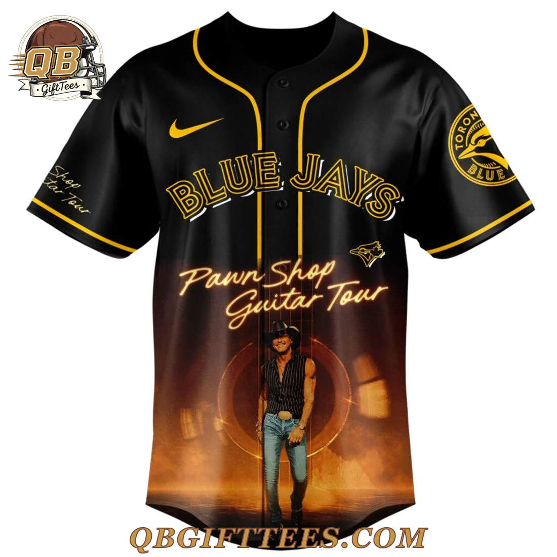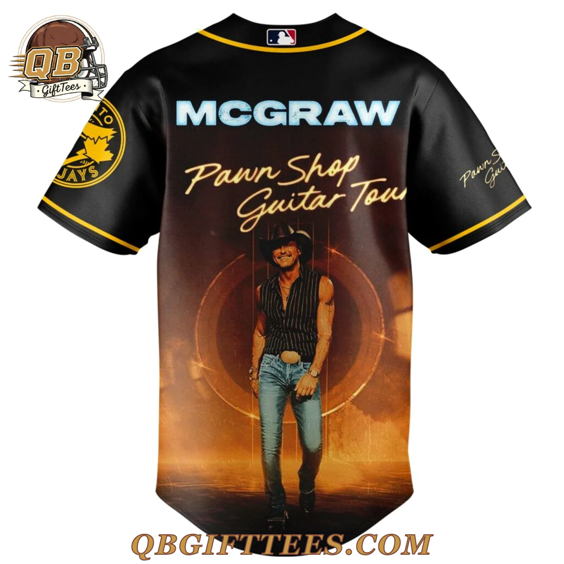 For fans who appreciate the enduring spirit of country music and the pride of baseball, the Toronto Blue Jays x Tim McGraw Pawn Shop Guitar Tour Edition Jersey offers a unique way to celebrate both passions. This black full-button baseball jersey features vibrant yellow piping along the placket, collar, and sleeve cuffs. The front showcases “BLUE JAYS” in yellow outline lettering across the chest, with a smaller Toronto Blue Jays bird logo directly below it. A yellow swoosh is visible on the right chest. Below the team branding, the phrase “Pawn Shop Guitar Tour” is presented in a flowing yellow script, accompanied by a full-body graphic of Tim McGraw in his signature style. The left sleeve proudly displays a circular Toronto Blue Jays logo with a maple leaf. On the back, “MCGRAW” is prominently displayed in white lettering with a blue outline at the top, followed by the “Pawn Shop Guitar Tour” script and another detailed graphic of Tim McGraw. The jersey is crafted from a lightweight, breathable 100% polyester fabric, designed for comfort and durability during wear.