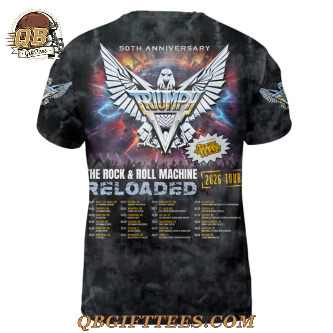 The Triumph 50 Year Anniversary Edition Shirt is a genuine tribute to the enduring legacy of one of rock’s most dynamic power trios, connecting fans across generations who appreciate their distinctive sound and electrifying live performances. The front of this shirt showcases a vibrant, full-color sublimation print on a dark, tie-dye-like background. Prominently featured at the top is “50th ANNIVERSARY,” beneath which the iconic “TRIUMPH” logo takes center stage. Below, a dramatic concert scene unfolds, capturing the essence of the band’s live energy with a drummer at the kit, a guitarist to the right, and bright stage lighting. The reverse side features the “50th ANNIVERSARY” text and the TRIUMPH logo, this time framed by a powerful eagle wing motif. Below, “THE ROCK & ROLL MACHINE RELOADED 2026 TOUR” is displayed, complete with an extensive list of apparent tour dates and cities, alongside a curious “APRIL FOOLS!” burst. Both sleeves are adorned with a smaller, stylized eagle wing emblem. This graphic tee is crafted from a lightweight, breathable polyester fabric, ensuring vibrant print reproduction and comfortable wear.