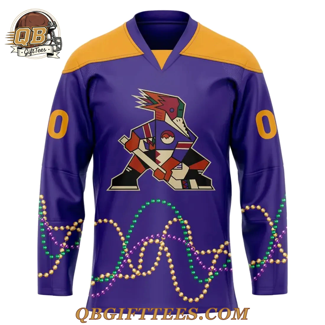 The Tucson Roadrunners 2026 Mardi Gras Custom Name Jersey connects fans to the team’s vibrant spirit with a festive twist, celebrating both hockey passion and cultural festivity. This unique jersey features a rich purple base, accented by striking gold shoulders and a V-neck collar. The front prominently displays the Tucson Roadrunners’ geometric roadrunner logo, depicted in a dynamic pose with a hockey stick. Cascading across the front and sleeves are festive Mardi Gras bead graphics in shimmering gold, green, and purple. Each sleeve is marked with a bold ‘0’ digit. The reverse of the jersey mirrors this festive design, featuring the same Mardi Gras bead graphics across the lower back. Above, “ANY NAME” text is presented in a clear white font, followed by a large, customizable “00” number, allowing for personal fan customization. The upper back proudly displays the CCM logo. Crafted from a premium, breathable polyester knit fabric, this jersey offers durability and comfort suitable for active wear or display. It features a standard athletic fit, designed to provide a comfortable drape without restricting movement, typical of quality performance sports apparel.
