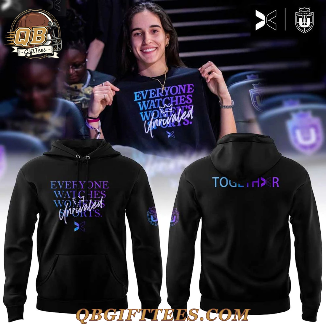 For fans passionate about the growing momentum of women’s basketball and the spirit of collective support, the Unrivaled Basketball Everyone Watches Womens Sports T-Shirt offers a direct statement. This essential fan garment is designed to celebrate the visibility and impact of women’s sports. The front of the black t-shirt features the phrase “EVERYONE WATCHES WOMEN’S Unrivaled SPORTS.” The words “EVERYONE WATCHES WOMEN’S SPORTS” are printed in a striking gradient, transitioning from a vibrant blue to a rich purple, with “Unrivaled” presented in a dynamic white script font accented by a purple outline. A small, stylized Unrivaled logo is positioned beneath the text. On the back, the word “TOGETHR” (with a “>” symbol replacing the ‘E’) is displayed in the same blue-to-purple gradient, embodying unity. The left sleeve features an additional Unrivaled brand mark. Crafted from 100% preshrunk cotton jersey, this t-shirt provides a comfortable, medium-weight feel at approximately 5.3 oz/yd² (180 gsm), offering durability and softness for everyday wear.