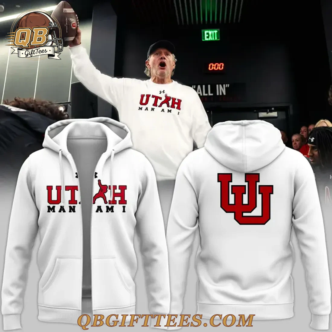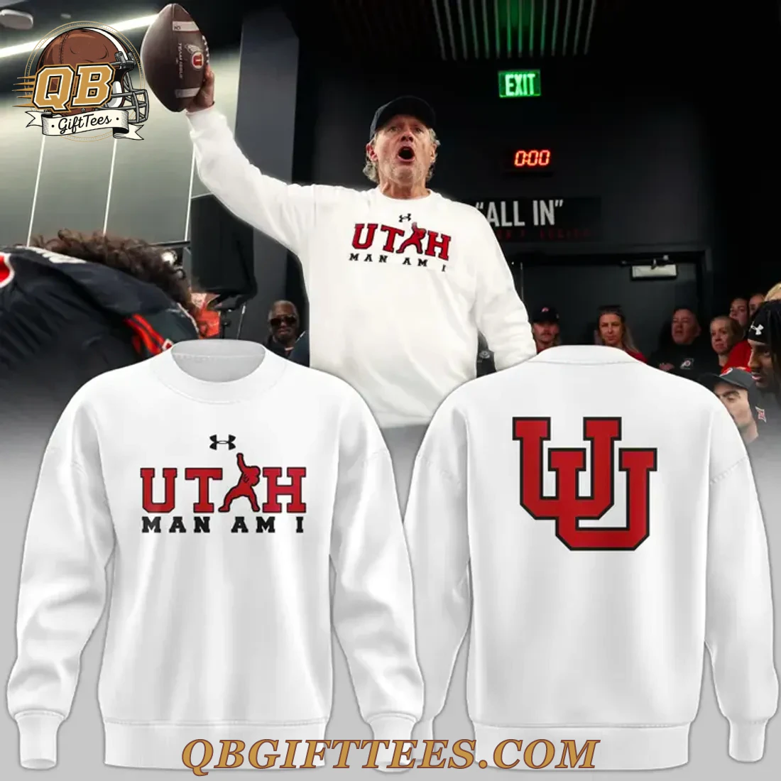 Embody the spirit and unwavering pride of Utah Football with the Utah Football Special Edition Shirt. Designed for fans of all generations, this white crew-neck short-sleeve shirt prominently features the iconic ‘UTAH’ text in bold red on the front, with the ‘A’ cleverly stylized as a dynamic football player silhouette, capturing the energy of game day. Below, the phrase ‘MAN AM I’ is printed in black, accompanied by a subtle black Under Armour logo above the main graphic. The back of the shirt proudly displays the instantly recognizable, large red interlocking ‘UU’ logo of the Utah Utes. Crafted from a premium, soft-touch cotton blend fabric, this shirt offers a comfortable fit suitable for everyday wear. It features a durable, mid-weight textile construction, typically around 5.3 oz/yd (180 g/m), ensuring both comfort and longevity.