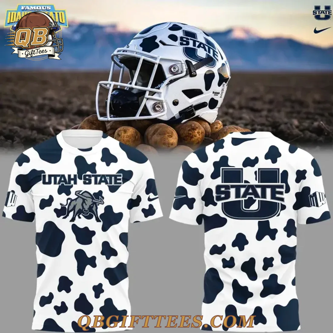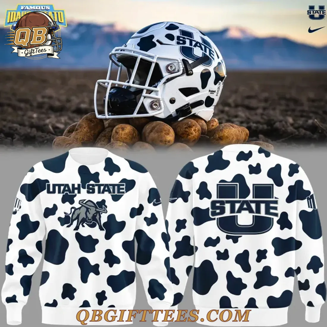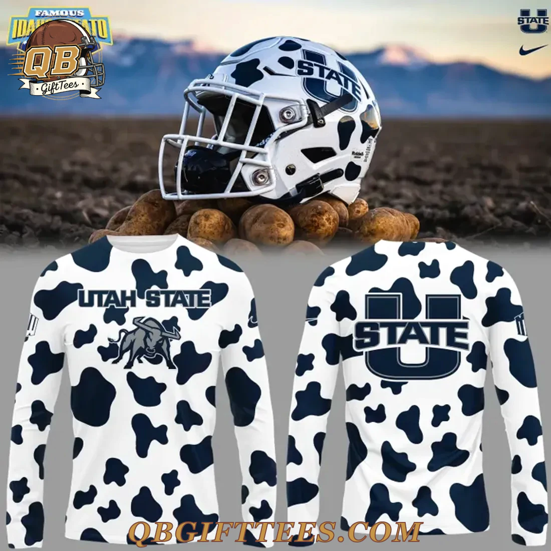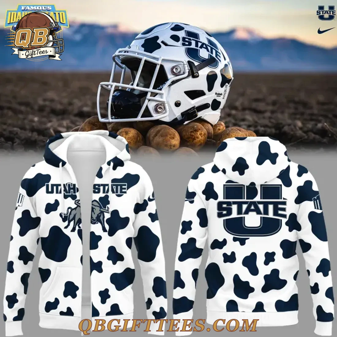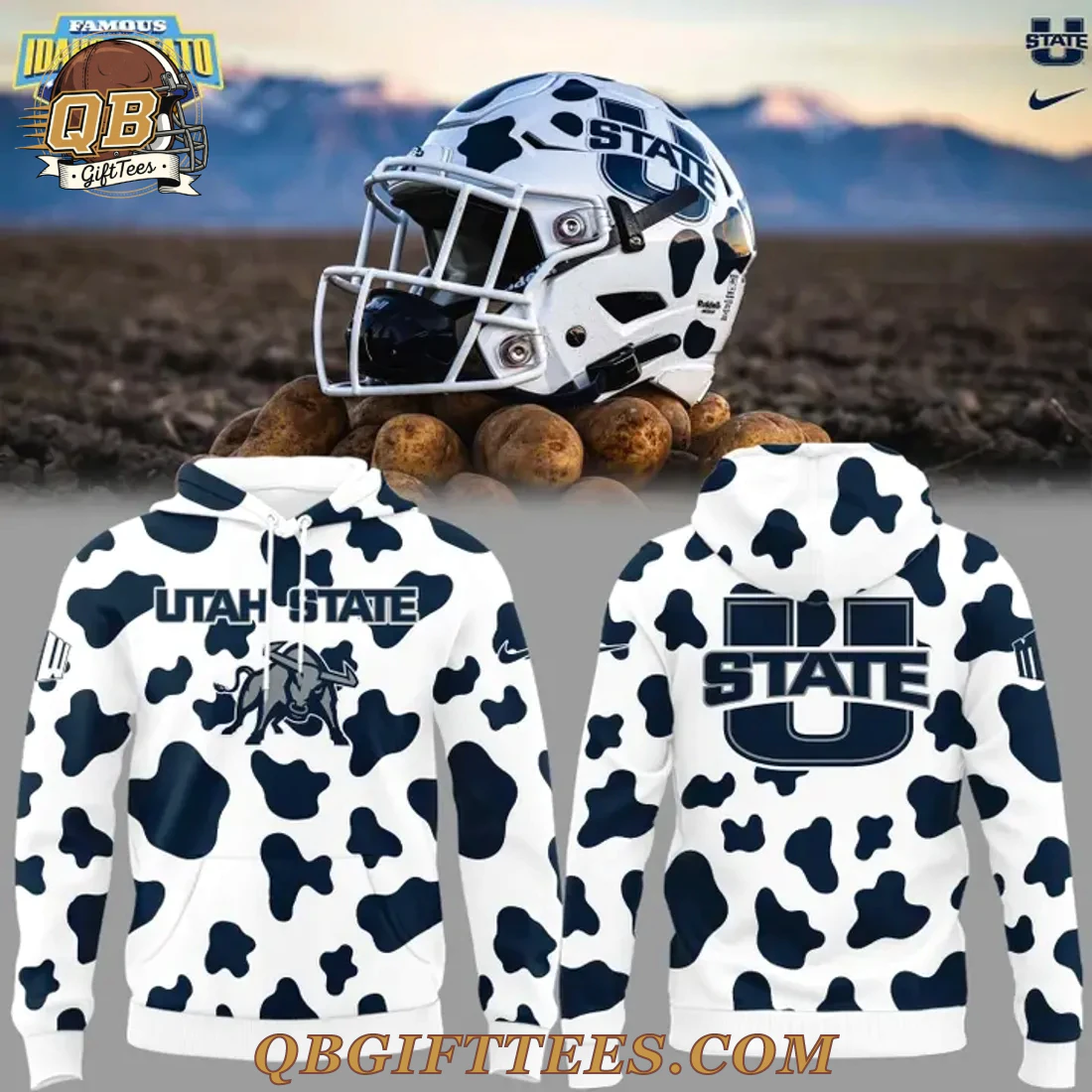 Embrace your Aggie pride with the Utah State Aggies Best Helmet Limited Edition Hoodie, a unique piece designed for dedicated fans. This distinctive pullover hoodie features a crisp white base adorned with an all-over, irregular dark blue cow print pattern, inspired by the team’s iconic ‘Cowboy Up’ spirit often seen during bowl appearances. The front proudly displays “UTAH STATE” in dark blue lettering above a detailed Aggie bull mascot graphic. On the left sleeve, the classic U-State logo is featured, while the right sleeve includes a dark blue swoosh. The back of the hoodie showcases a prominent “U STATE” logo in dark blue, affirming your allegiance from every angle. Crafted from a smooth, durable 100% polyester fabric, this hoodie is designed for comfort. It features a brushed interior for added warmth and a practical front pouch pocket. The fabric weight is approximately 8.0 oz/yd² (270 gsm), offering a comfortable, mid-weight feel.