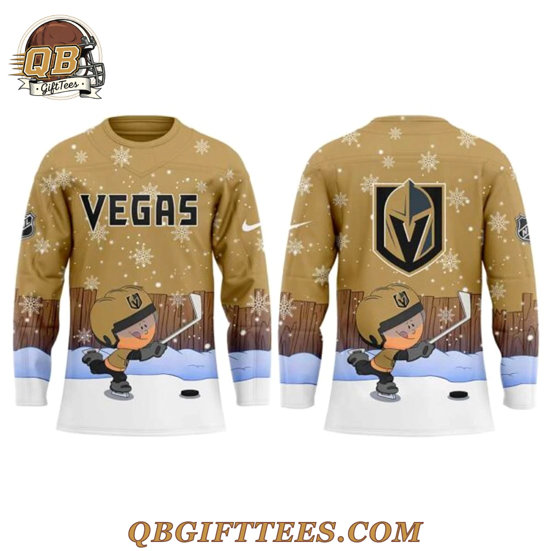 Celebrate your passion for hockey and a beloved gaming icon with the VG Knights x Pablo Sanchez Limited Edition Hockey Jersey. This unique garment brings together the thrilling spirit of Vegas Golden Knights hockey with the charm of the legendary Pablo Sanchez, appealing to fans who appreciate both on-ice action and nostalgic gaming. The jersey features a striking gold base adorned with an all-over white snowflake pattern, creating a festive, wintry aesthetic. A detailed wooden fence motif stretches across the lower sleeves and body, transitioning into a snow and ice landscape. On the front, “VEGAS” is boldly displayed in black text, while a stylized cartoon Pablo Sanchez, geared up for hockey, appears on both the front and back, stickhandling a puck. The official Vegas Golden Knights logo is prominently placed on the upper back and left sleeve, complemented by a swoosh on the right chest and an NHL shield on the right sleeve. Constructed from 100% breathable polyester fabric, this fan replica jersey offers a comfortable, relaxed fit, ideal for layering or casual wear.