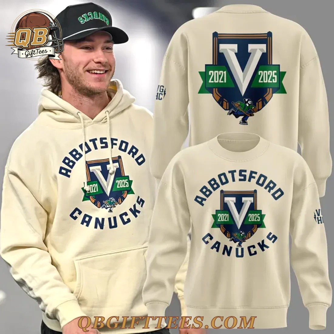 Celebrate a milestone for your favorite AHL team with the Violent Gentlemen x Abbotsford Canucks 5th Anniversary Collab Limited Edition Hoodie. This special release commemorates five years of exciting hockey in the Fraser Valley, connecting fans with a unique piece of team history. The cream-colored hoodie features a prominent front graphic: “ABBOTSFORD” arched in navy blue above a distinctive shield emblem. This shield, rendered in navy and dark green, showcases a large white ‘V’ for Violent Gentlemen, overlaid with a green banner displaying “2021” and “2025” to mark the anniversary period. Below the ‘V’ is the iconic Abbotsford Canucks orca logo. “CANUCKS” in navy blue completes the front design. The back of the hoodie mirrors the shield emblem in a larger format, while the left sleeve features “VG/HC” text vertically. Crafted from a premium heavyweight fleece blend, this pullover hoodie offers a soft interior lining for comfort and warmth, complete with a classic front kangaroo pocket and adjustable drawstring hood.