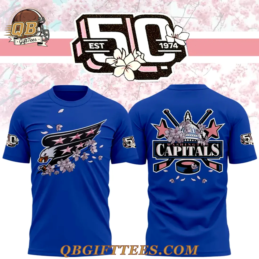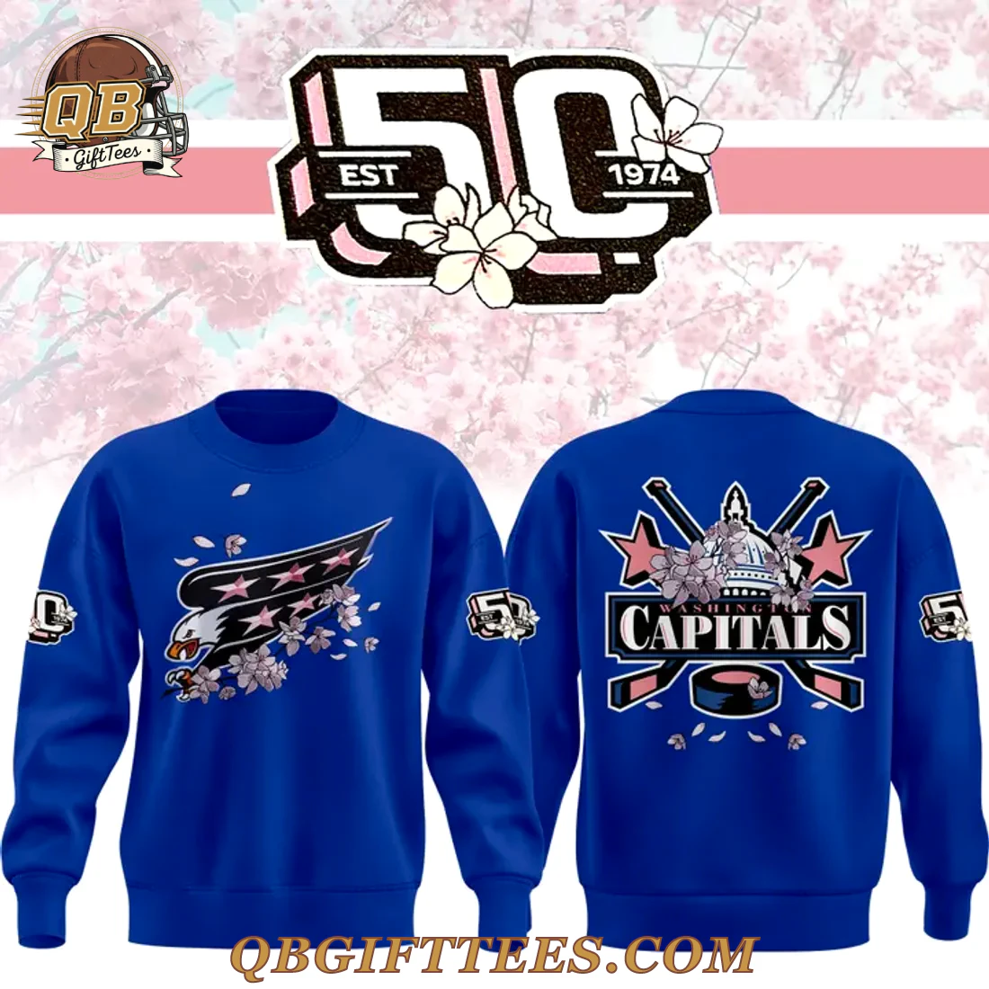 Celebrate half a century of hockey history with the Washington Capitals 50th Anniversary Limited Edition Hoodie, a tribute to the team’s enduring legacy and loyal fanbase. This garment is designed to connect fans across generations, from those who witnessed the inaugural season to the newest supporters. The hoodie features a vibrant royal blue base color. The front displays a central graphic showcasing ‘WASHINGTON CAPITALS’ text beneath a stylized depiction of the U.S. Capitol dome, flanked by crossed hockey sticks and a puck. Delicate cherry blossoms are intricately woven into the design, adding a unique regional touch, alongside star accents. Both sleeves feature a distinct ’50’ emblem with ‘EST 1974’ and additional cherry blossom details, commemorating the milestone. The back of the hoodie remains unadorned in solid royal blue. Constructed from a premium 8 oz (270 GSM) blend of 50% cotton and 50% polyester fleece, this hoodie offers both comfort and durability, complete with a functional drawstring hood and a practical front kangaroo pocket.