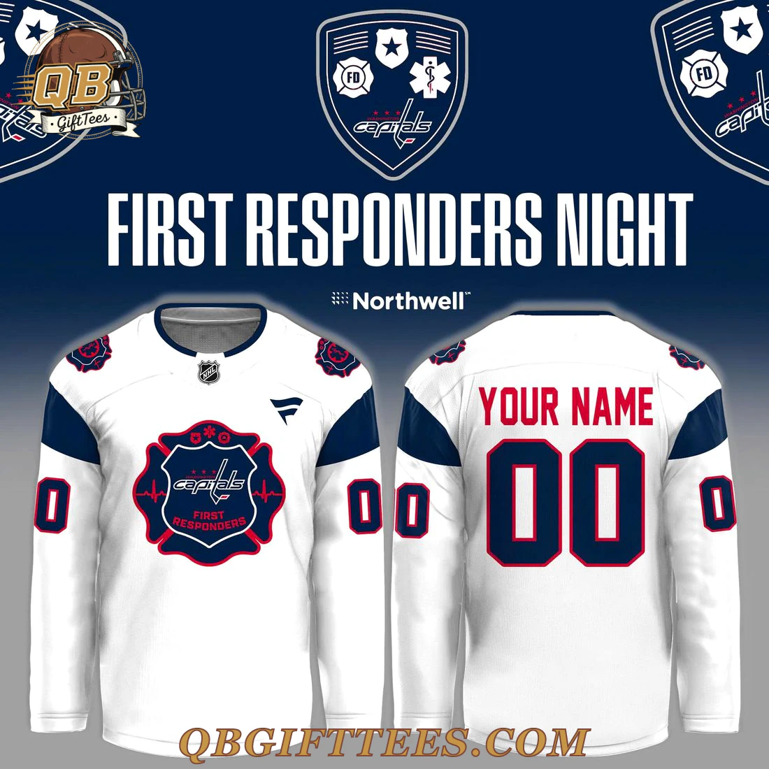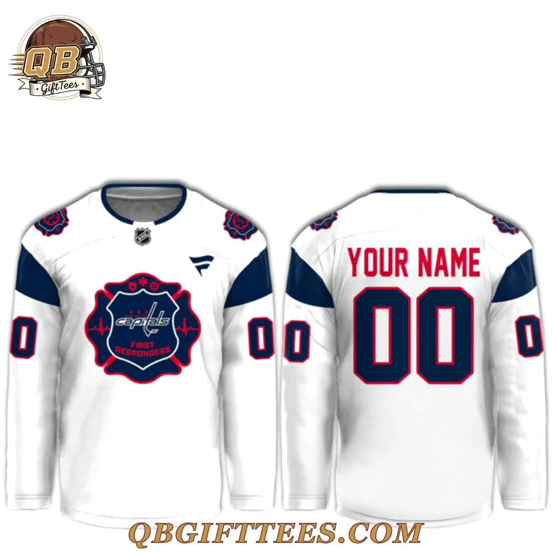 For Washington Capitals fans, the Washington Capitals First Responders Edition Custom Name Jersey is more than just apparel; it’s a profound statement of gratitude and support for the heroes who keep our communities safe. This special edition jersey features a crisp white base, accented with navy blue shoulder panels and sleeve stripes. The front proudly displays a unique shield emblem, incorporating the iconic Capitals wordmark alongside symbols representing fire, medical, and law enforcement services, all encircled by an ECG heartbeat line and “FIRST RESPONDERS” text at the bottom. The sleeves also feature a smaller navy blue stripe with a bold red “0” on each. An official NHL shield is positioned at the collar, and the Fanatics brand logo appears on the wearer’s right chest. The back is designed for personalization, offering space for “YOUR NAME” in striking red text above a large, customizable “00” in navy blue with a red outline. Crafted from 100% durable polyester mesh fabric, this jersey offers a lightweight feel, typically weighing around 200-220 GSM (grams per square meter), suitable for comfort and lasting wear.