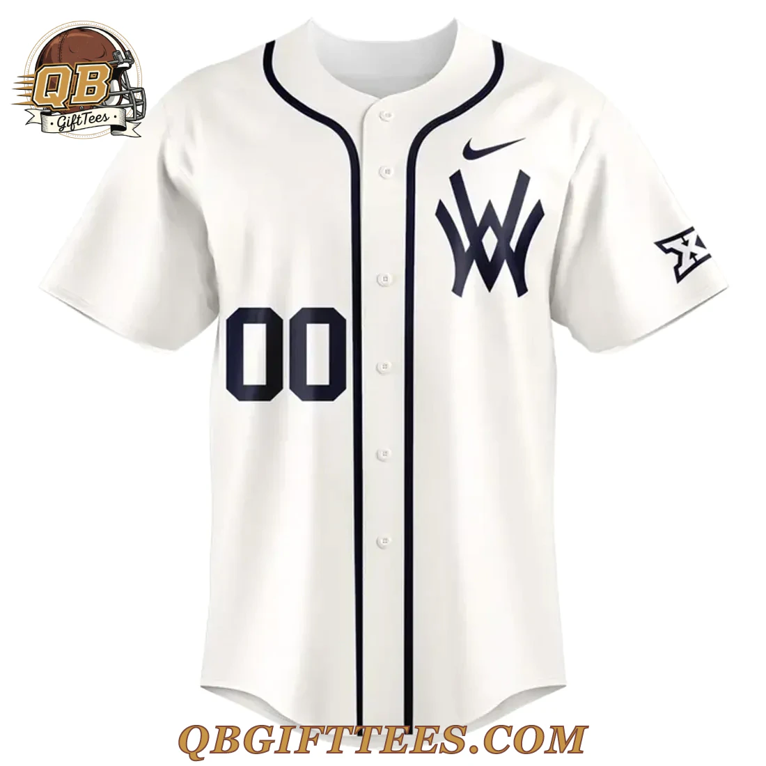 Celebrate your devotion to West Virginia Mountaineers baseball with the West Virginia Mountaineers 2026 New Edition Baseball Jersey. This jersey embodies the spirit of game day, connecting generations of fans from Morgantown and beyond. The design features a crisp cream-colored body complemented by rich navy blue accents. It boasts a full-button front with clean white buttons, framed by navy blue piping along the placket and collar. The iconic interlocking ‘WV’ logo is proudly stitched in navy blue on the front left chest, balanced by a navy blue swoosh on the front right chest. A bold ’00’ in navy blue is displayed on the lower front left. The right sleeve carries the distinguished Big 12 Conference logo in navy blue. Crafted from a premium 100% moisture-wicking polyester fabric, this jersey offers lightweight comfort and durable wear, engineered to keep you cool whether in the stands or on the field. The fabric weight and dimensions are consistent with high-performance athletic apparel.
