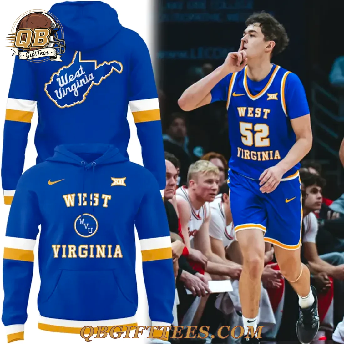 For dedicated fans of West Virginia University Basketball, the legacy of greatness transcends generations. This WVU Basketball Jerry West Throwback Limited Edition Hoodie embodies that enduring Mountaineer spirit, connecting past legends with present-day pride. The hoodie features a vibrant royal blue base. On the front, “WEST VIRGINIA” is prominently displayed in gold lettering, with the iconic “Flying WV” logo encapsulated in a circular emblem beneath “WEST”. A white swoosh is positioned above “WEST”, complemented by the Big 12 conference logo to its right. Distinctive white and gold stripes encircle the sleeves and bottom hem, providing a classic athletic aesthetic. The back of the hoodie showcases a bold gold outline of the state of West Virginia, with “West Virginia” text integrated within the geographical shape. This hoodie is crafted from a premium cotton-polyester blend fleece, offering a soft, comfortable feel and durable construction suitable for everyday wear. It includes a front kangaroo pocket and a drawcord hood, characteristic of a quality pullover hoodie.